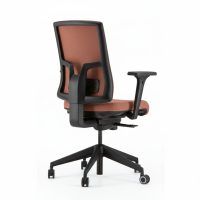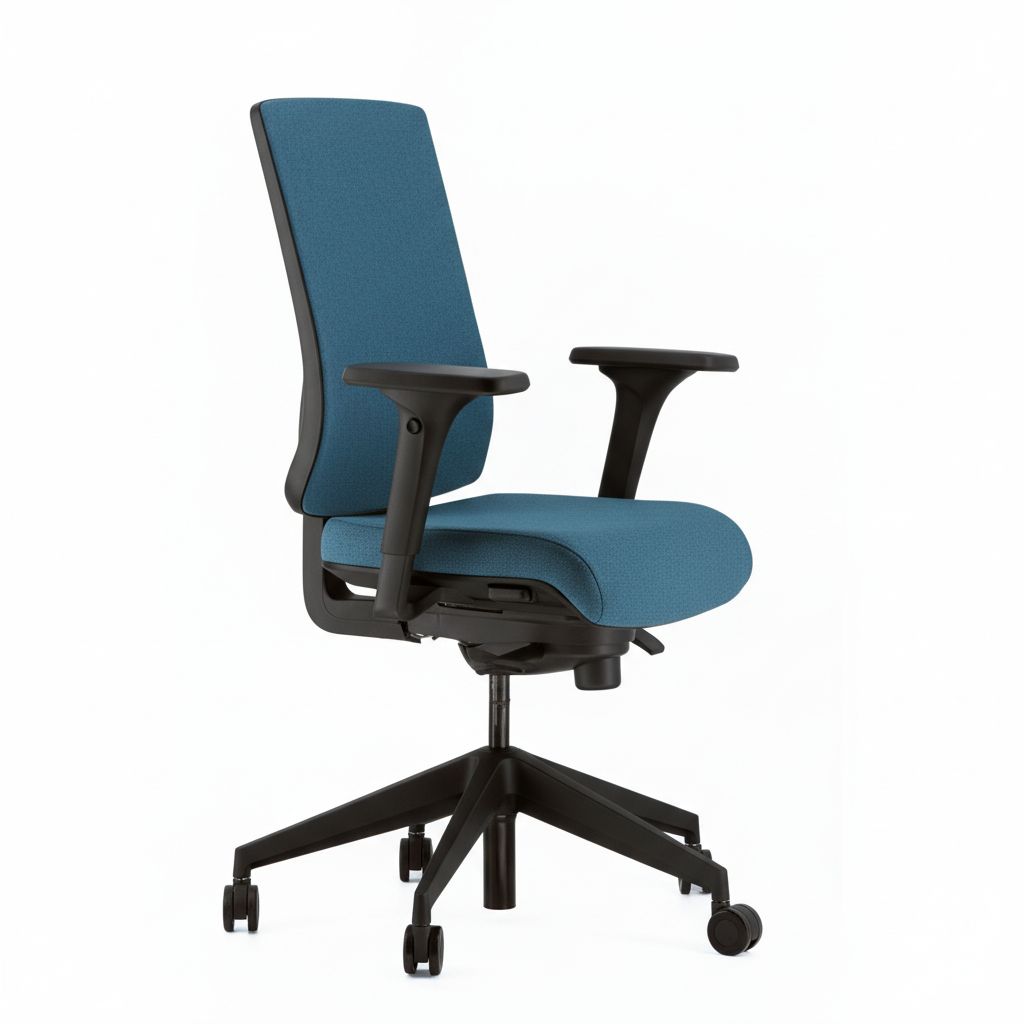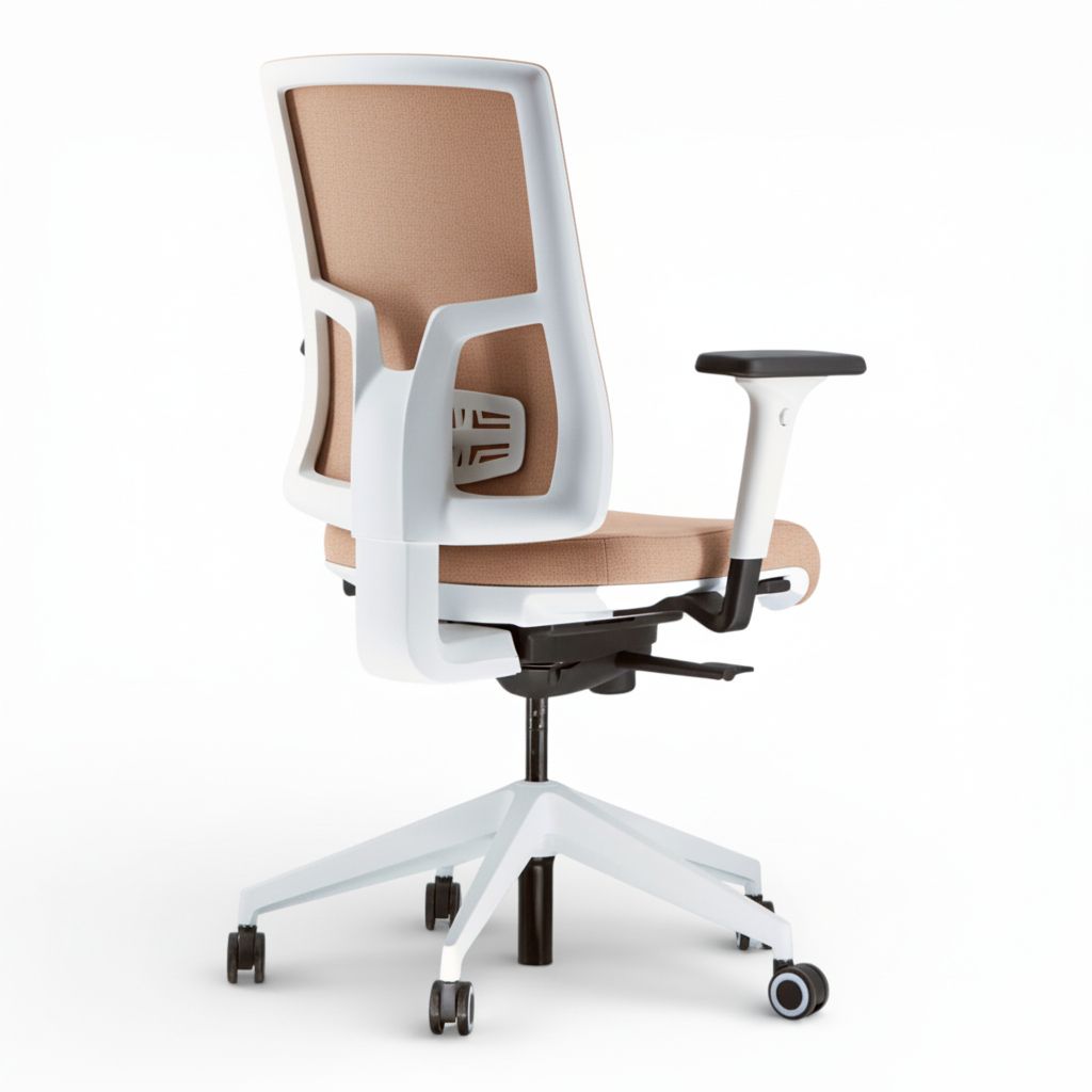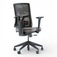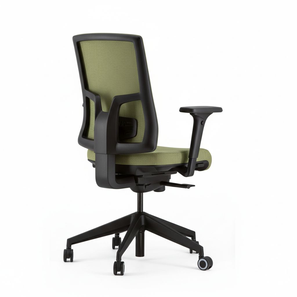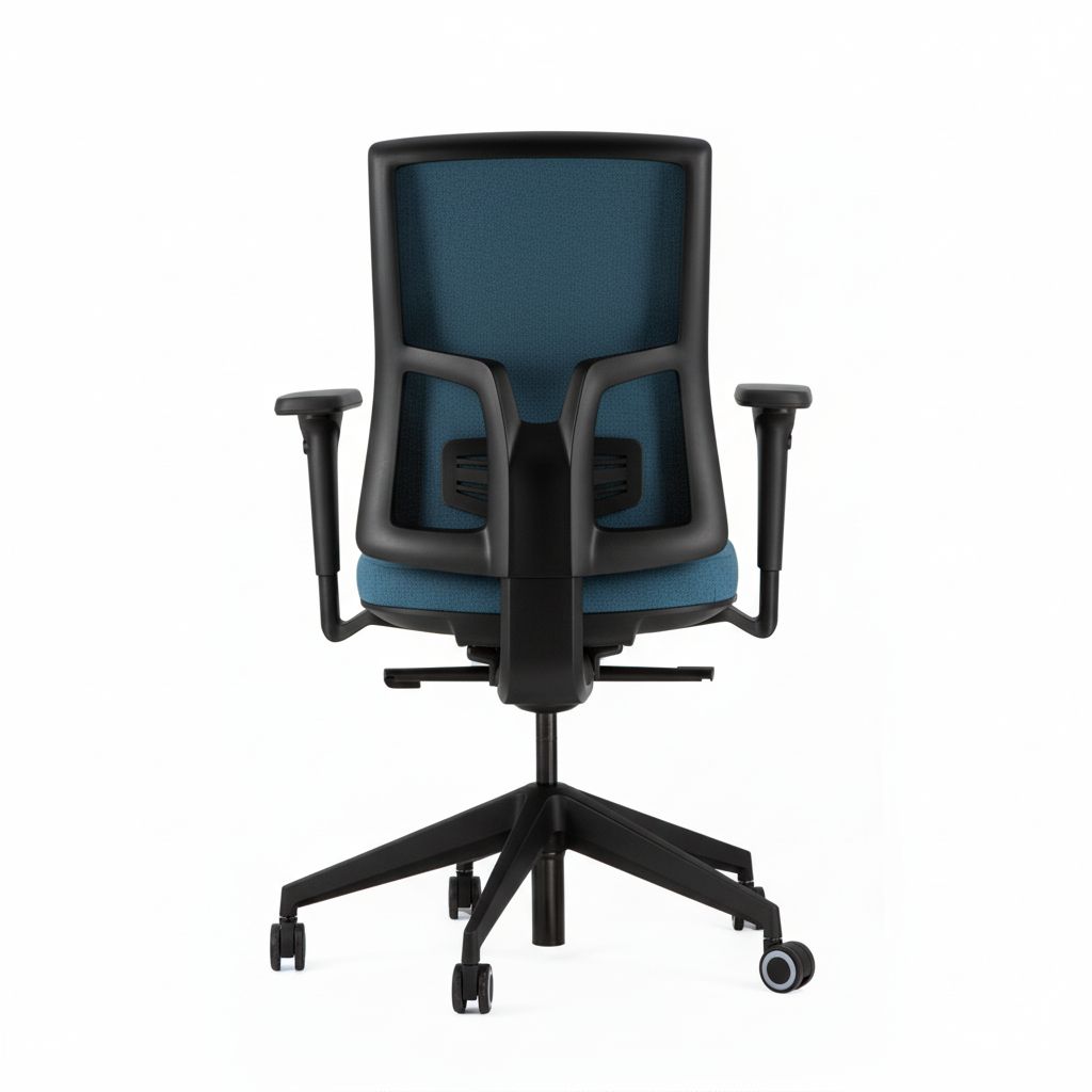 Oparcie fotela zostało wykonane z trwałej plastikowej ramy obszytej naciągniętą tkaniną, która zapewnia miękkie, stabilne podparcie pleców oraz estetyczną, spójną formę. Konstrukcja dopasowuje się do sylwetki użytkownika, wspierając wygodne siedzenie przez wiele godzin pracy. Tapicerowane wykończenie nadaje modelowi bardziej gabinetowy charakter, zachowując jednocześnie ergonomiczne właściwości niezbędne w codziennym użytkowaniu.