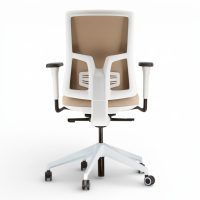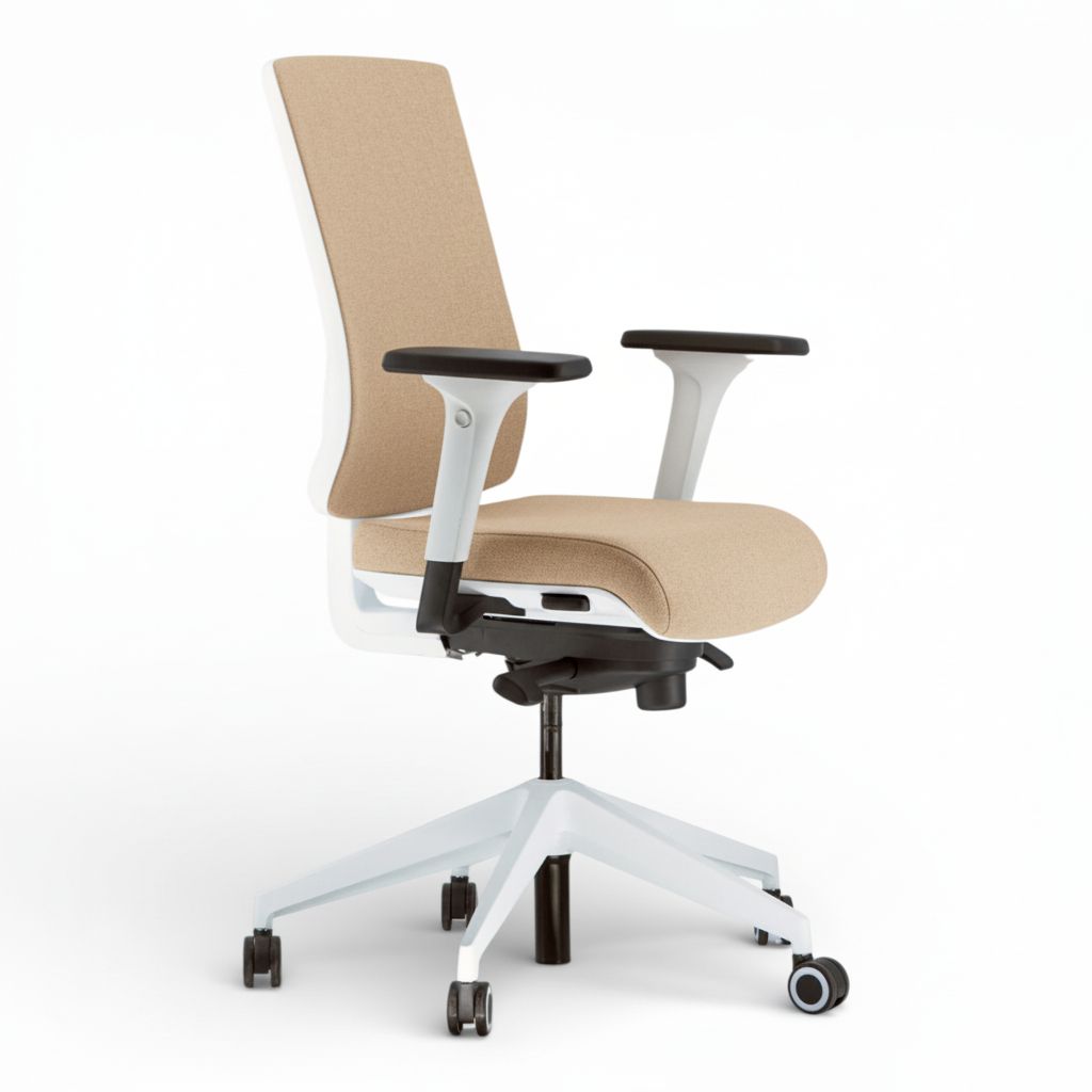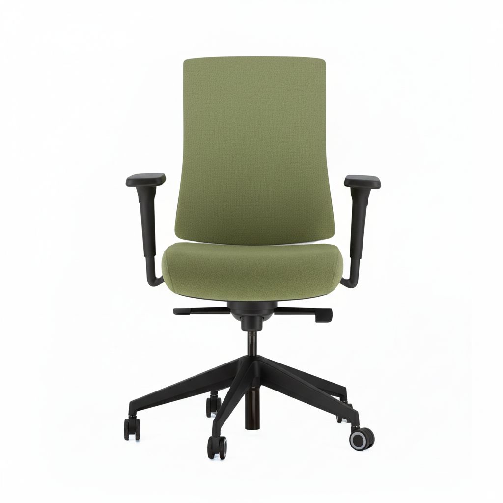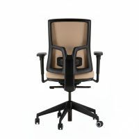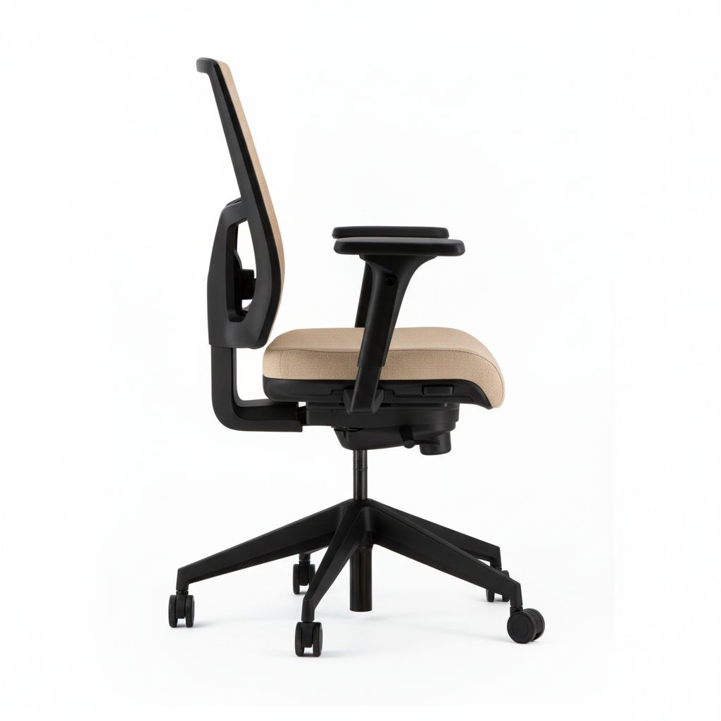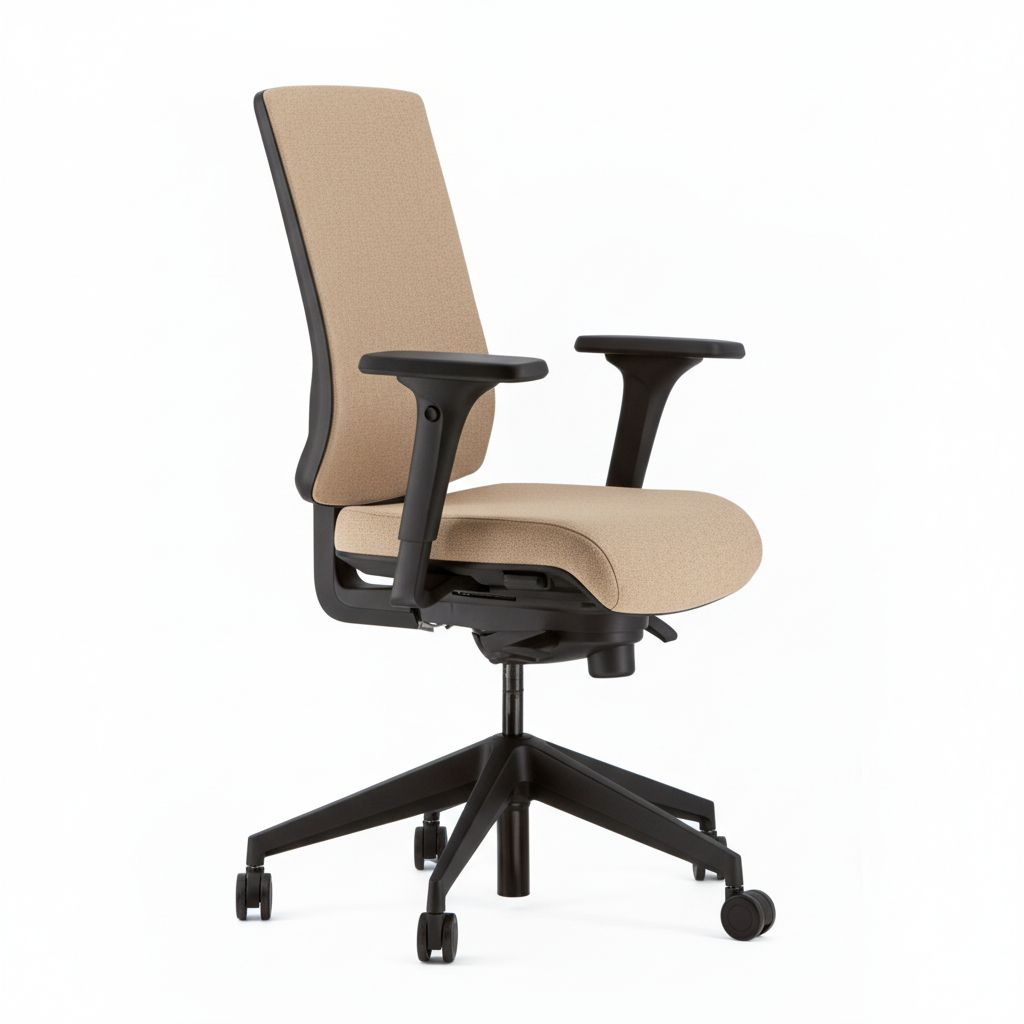 Oparcie fotela zostało wykonane z trwałej plastikowej ramy obszytej naciągniętą tkaniną, która zapewnia miękkie, stabilne podparcie pleców oraz estetyczną, spójną formę. Konstrukcja dopasowuje się do sylwetki użytkownika, wspierając wygodne siedzenie przez wiele godzin pracy. Tapicerowane wykończenie nadaje modelowi bardziej gabinetowy charakter, zachowując jednocześnie ergonomiczne właściwości niezbędne w codziennym użytkowaniu.