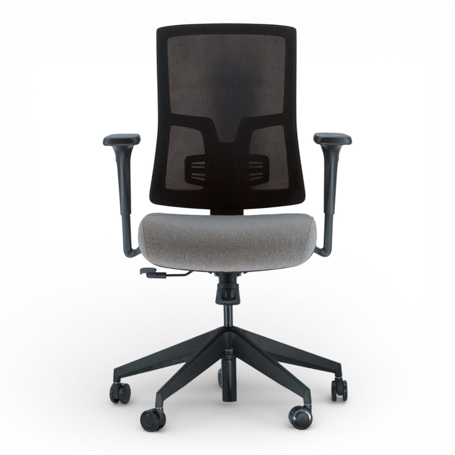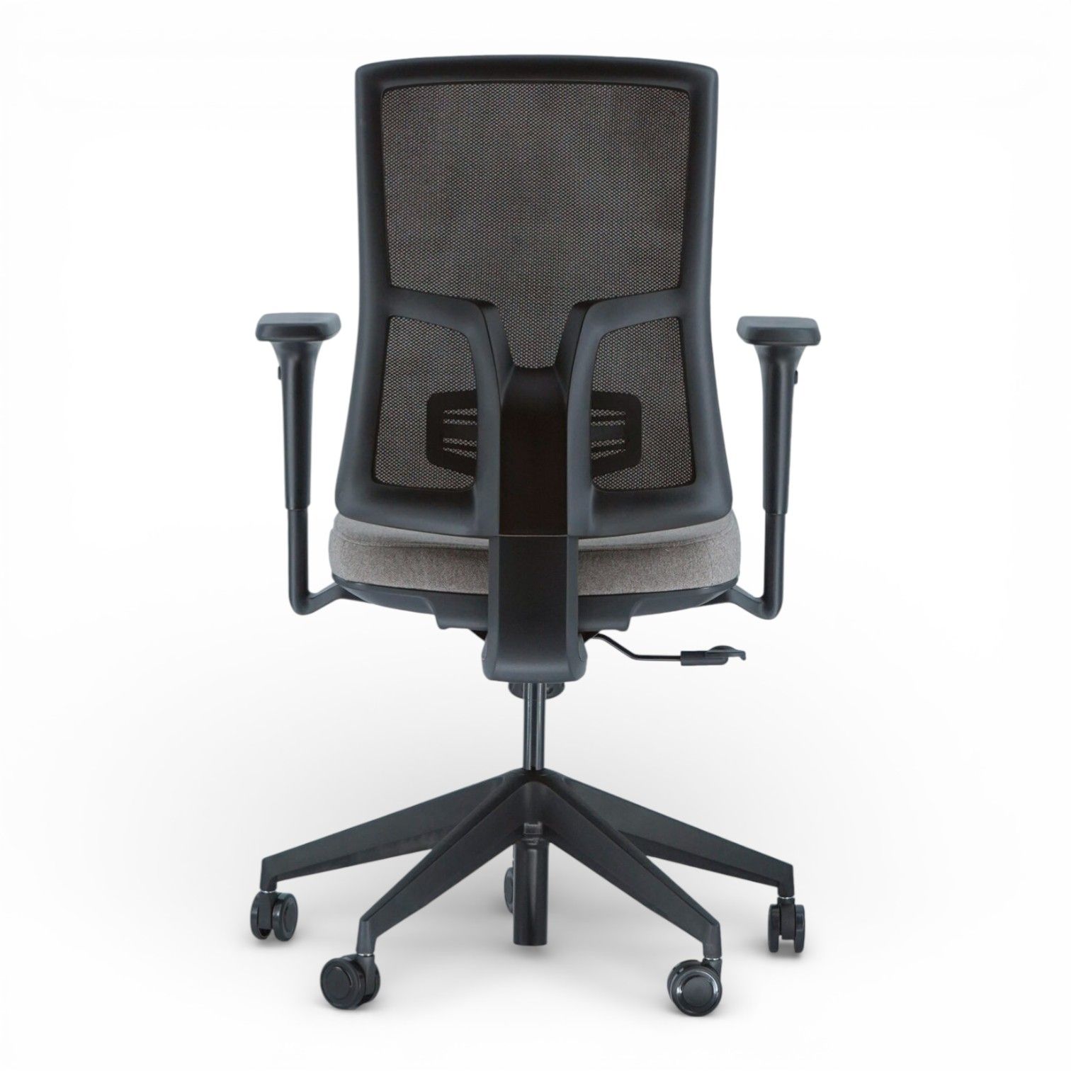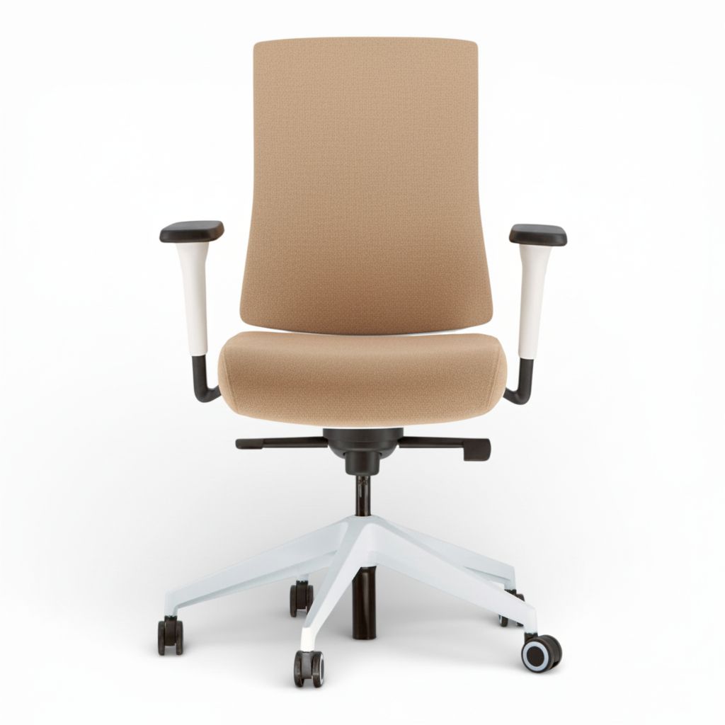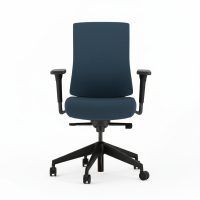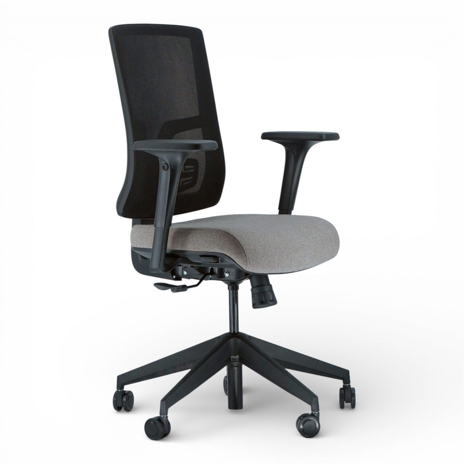 Oparcie fotela zostało wykonane z trwałej plastikowej ramy obszytej naciągniętą tkaniną, która zapewnia miękkie, stabilne podparcie pleców oraz estetyczną, spójną formę. Konstrukcja dopasowuje się do sylwetki użytkownika, wspierając wygodne siedzenie przez wiele godzin pracy. Tapicerowane wykończenie nadaje modelowi bardziej gabinetowy charakter, zachowując jednocześnie ergonomiczne właściwości niezbędne w codziennym użytkowaniu.